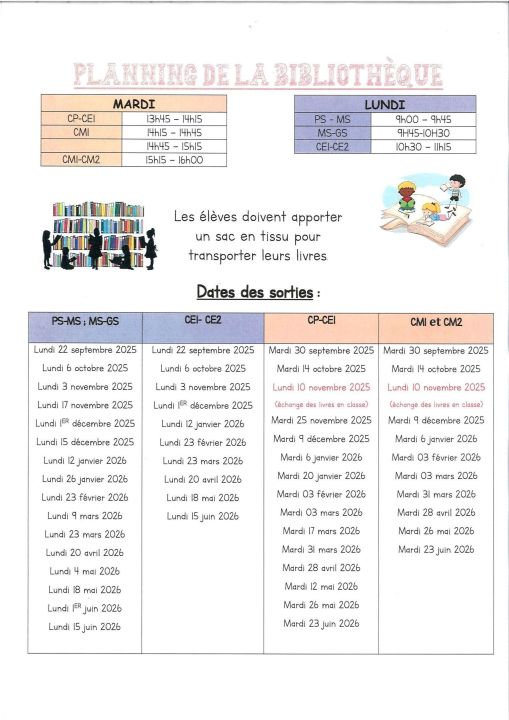 Planning de la bibliothèque 2025-2026 pour toutes les classes